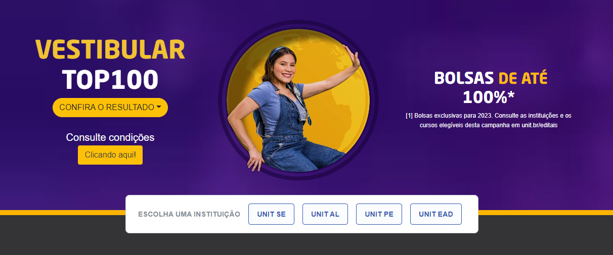 Os editais e regulamentos do Vestibular Top 100 estão disponíveis nos sites de Editais e de Regulamentos da Unit.